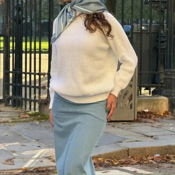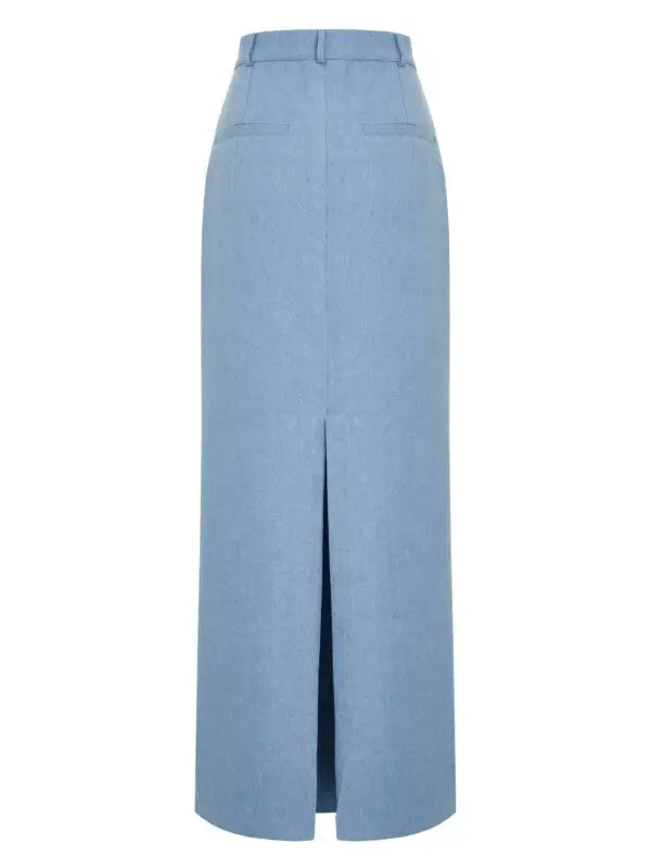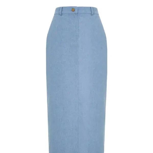 Jupe longue en jean bleu avec fente à l’arrière et bouton bronze. Coupe droite et taille haute.