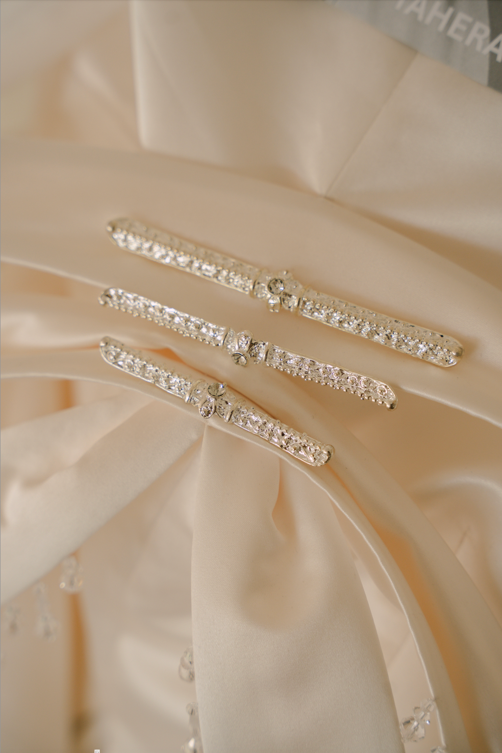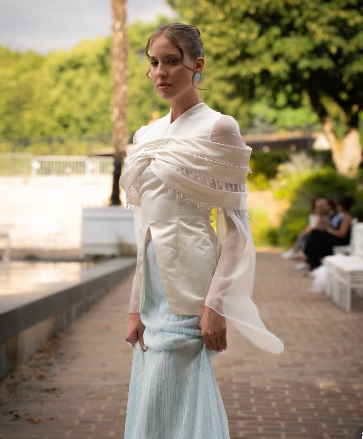 Inspirée de la robe traditionnelle tchétchène, cette robe de soirée se distingue par ses ornements en argent qui soulignent le devant de la silhouette. Ses longues manches en mousseline évasées apportent légèreté et mouvement, conférant à la pièce une allure raffinée et intemporelle.