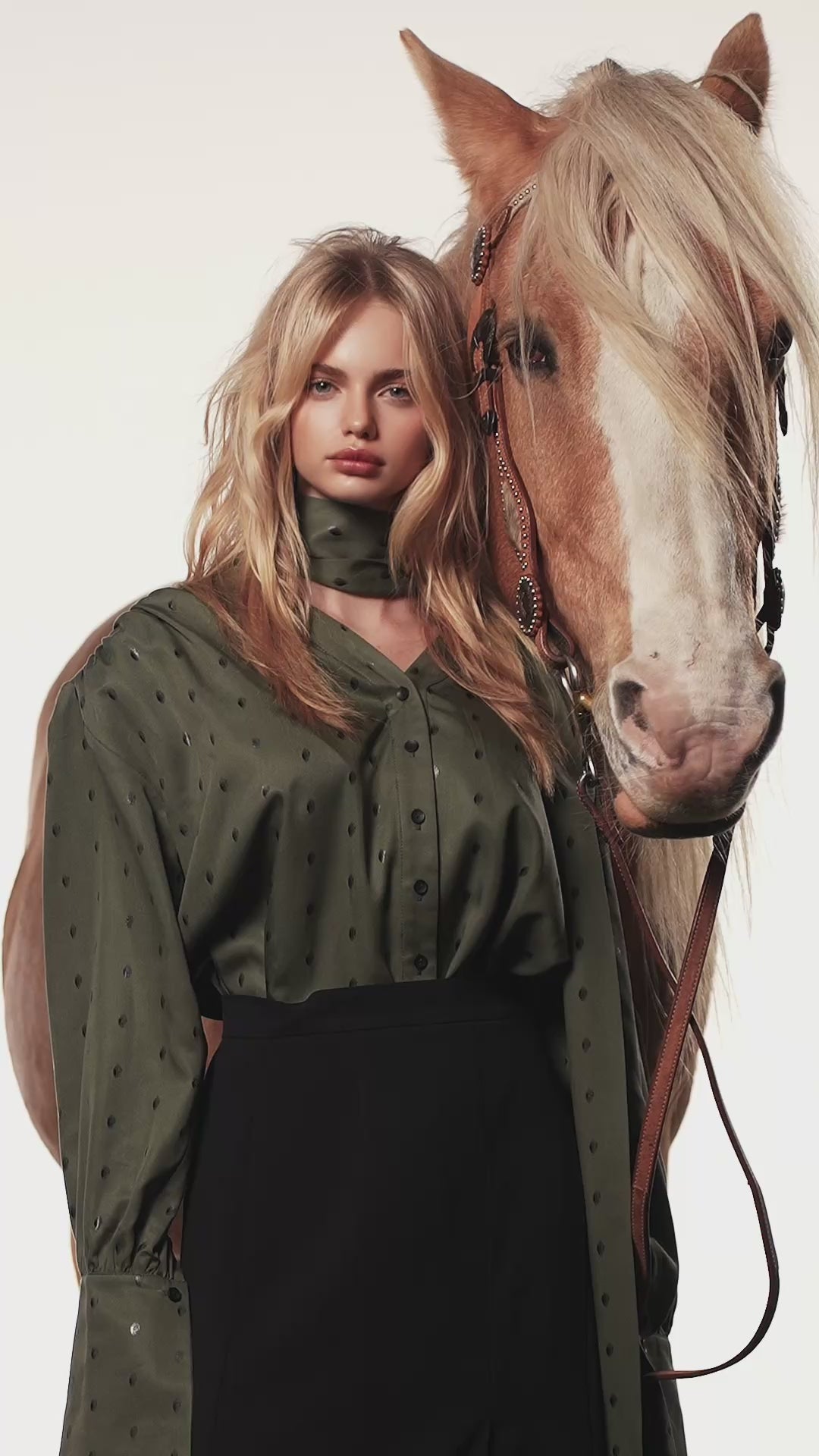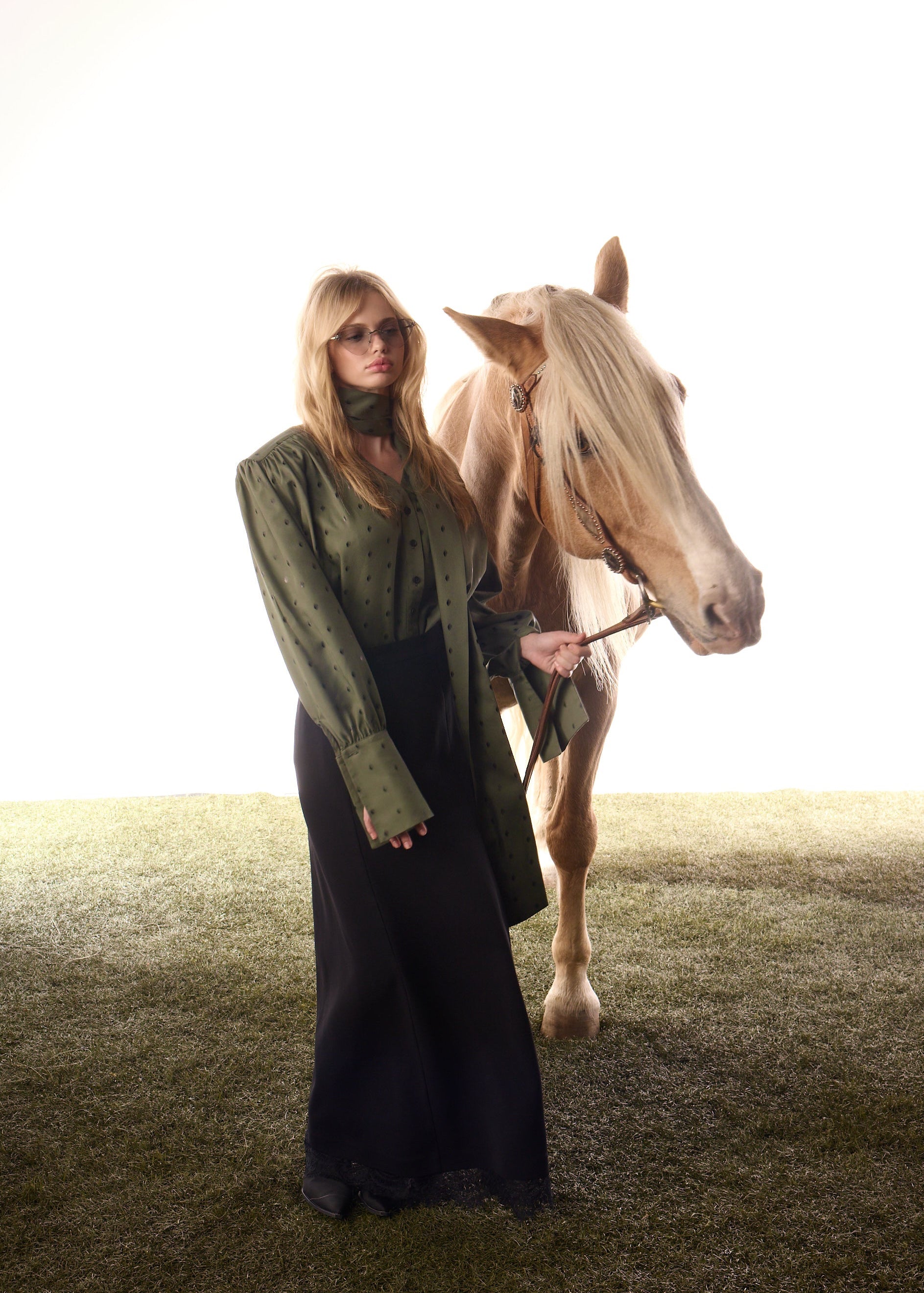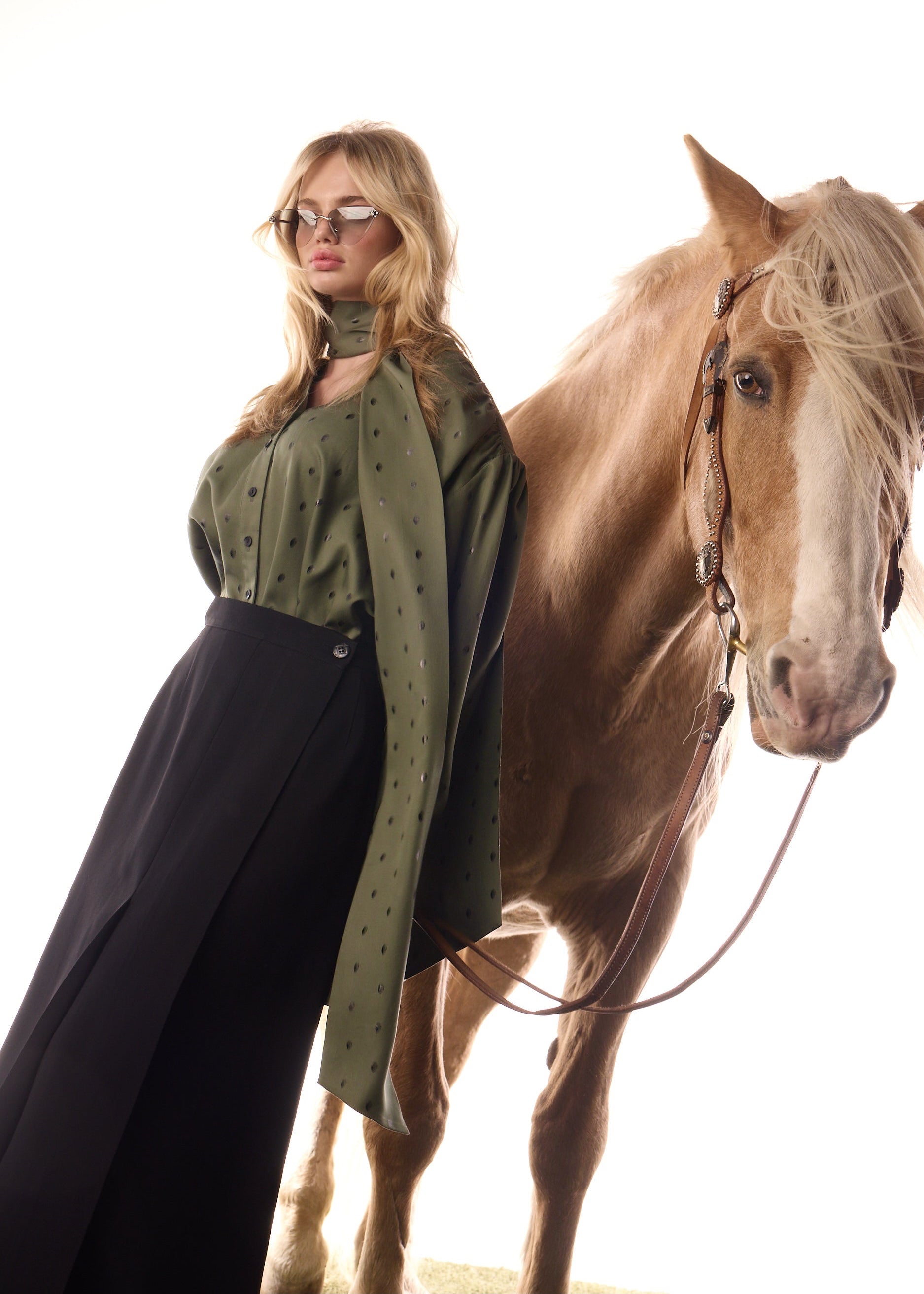 Chemise inspirée des années 50 de la capsule hiver, dotée de manches bouffantes, d’un col montant élégant et de poignets finement boutonnés