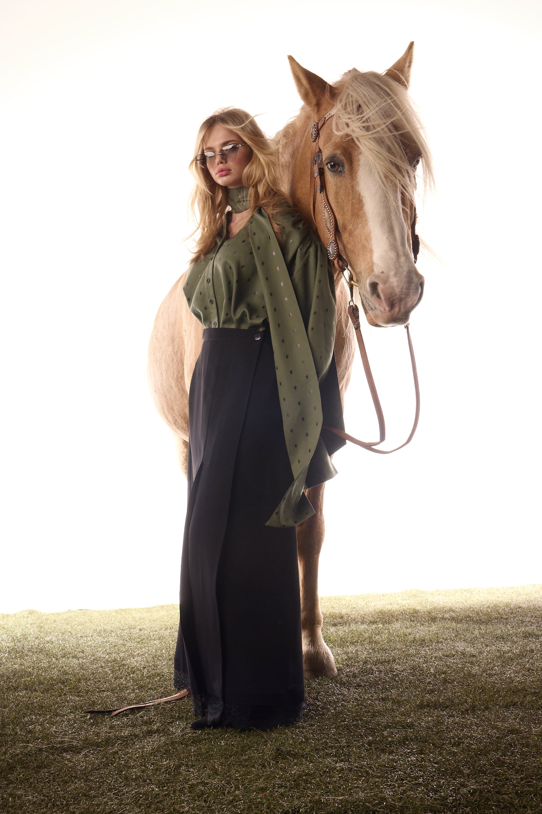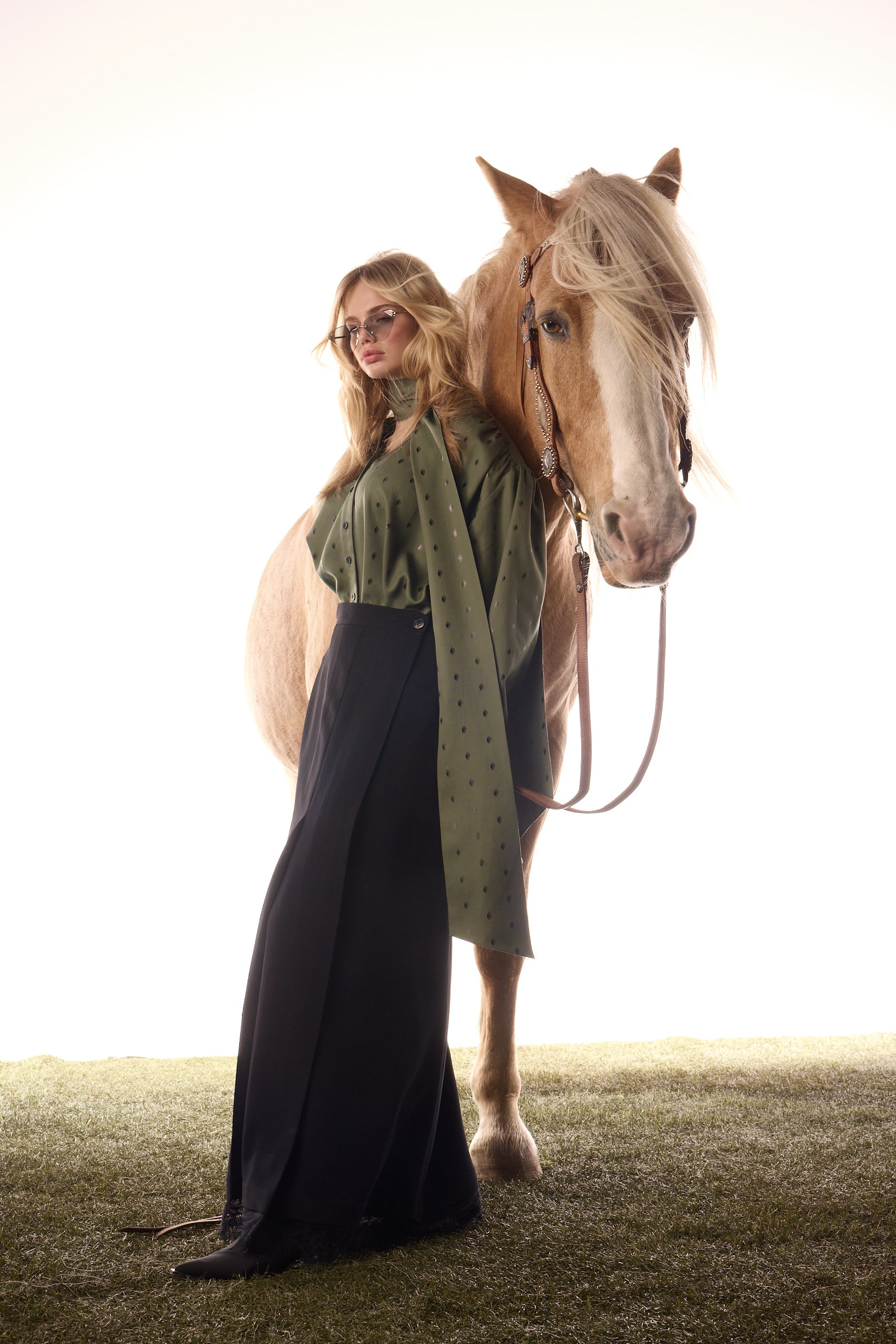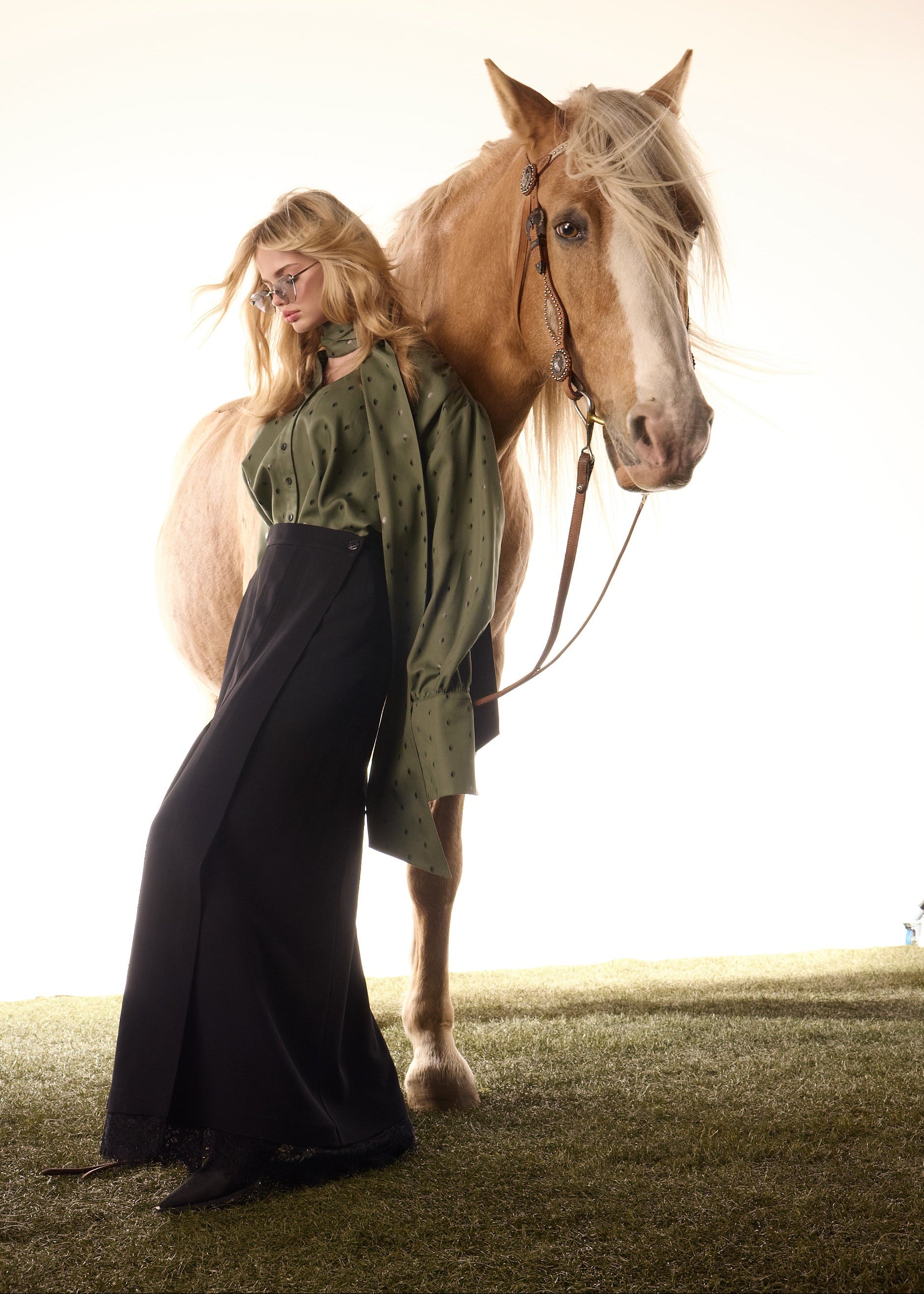 Chemise inspirée des années 50 de la capsule hiver, dotée de manches bouffantes, d’un col montant élégant et de poignets finement boutonnés