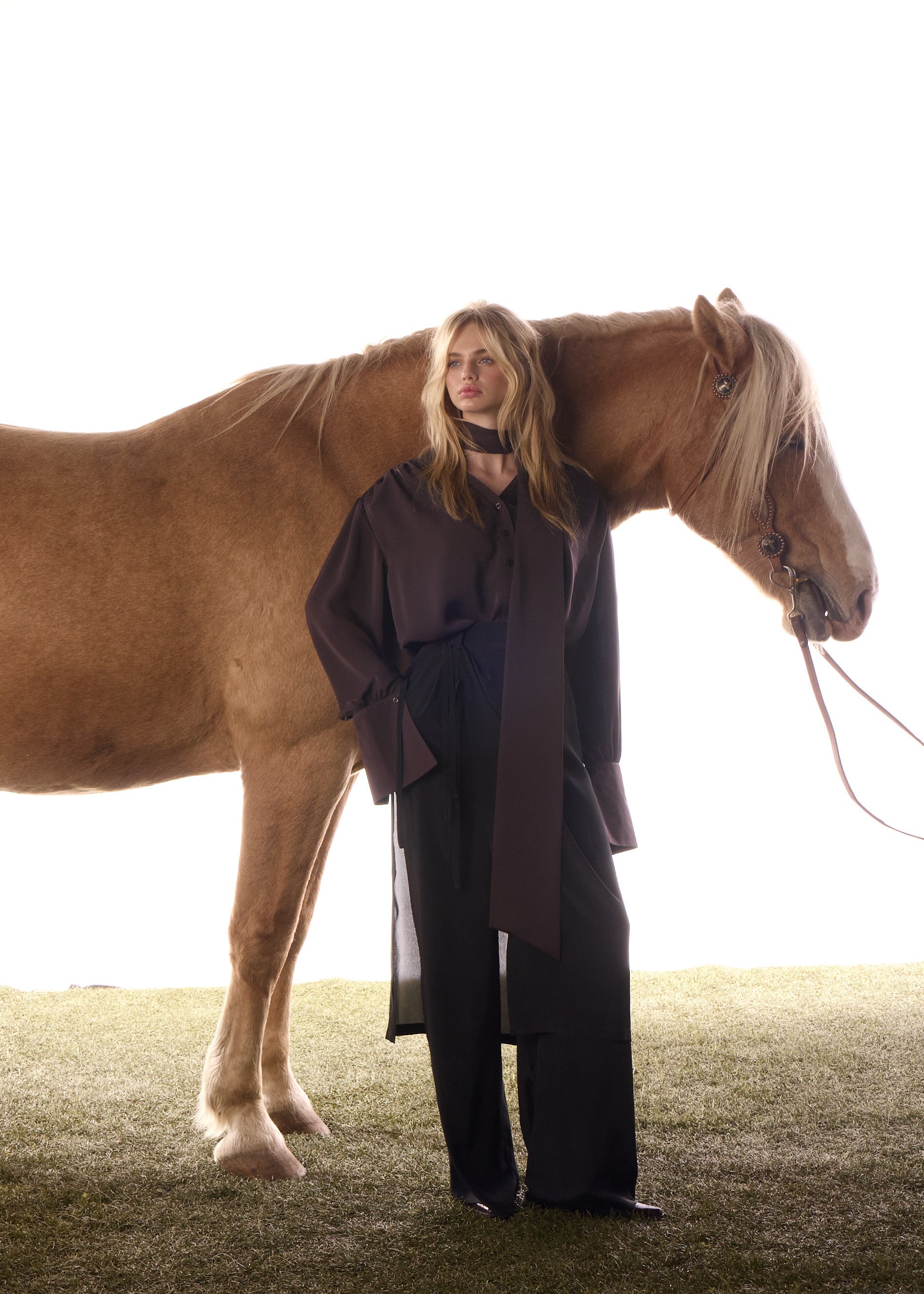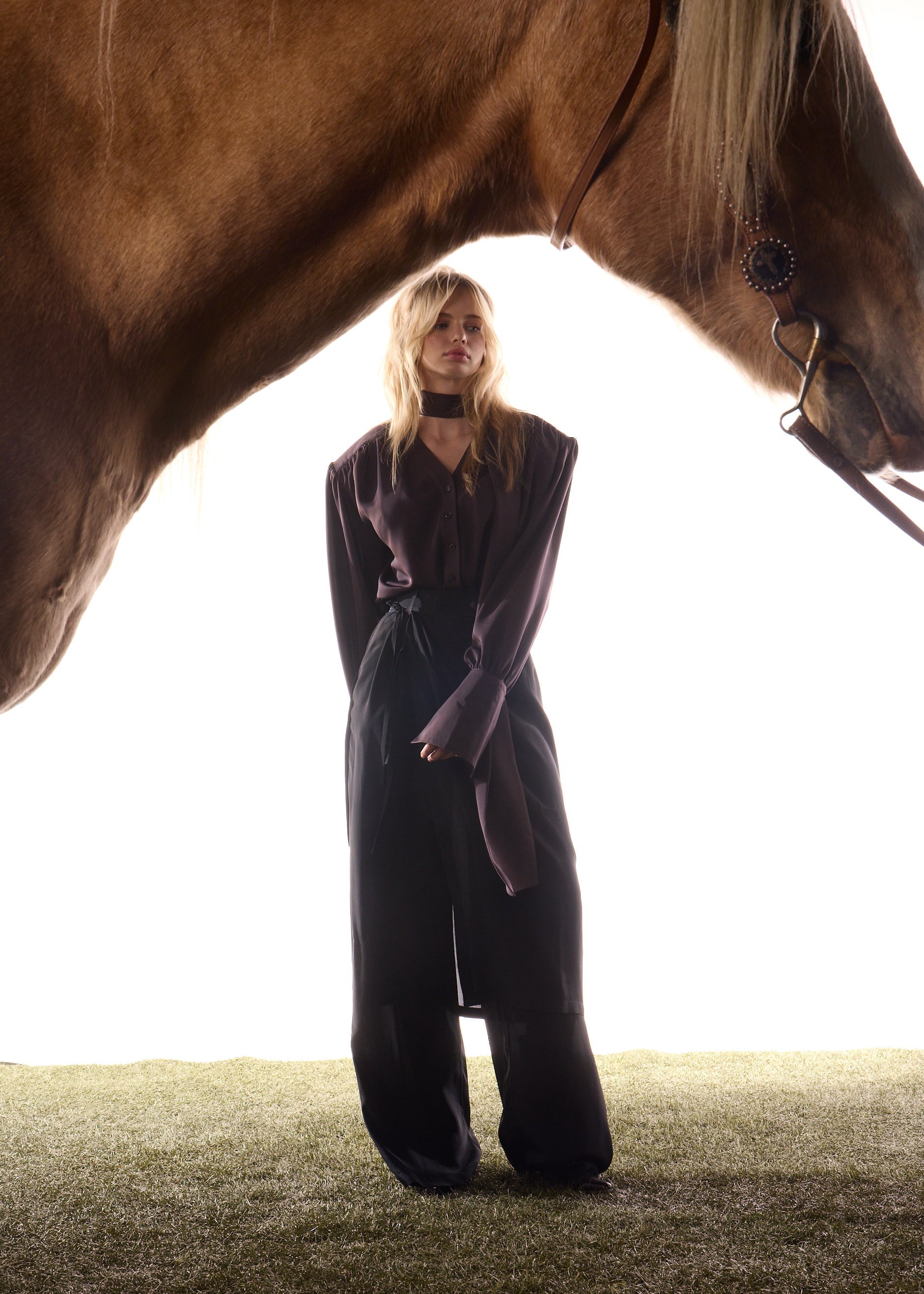 Chemise inspirée des années 50 de la capsule hiver, dotée de manches bouffantes, d’un col montant élégant et de poignets finement boutonnés