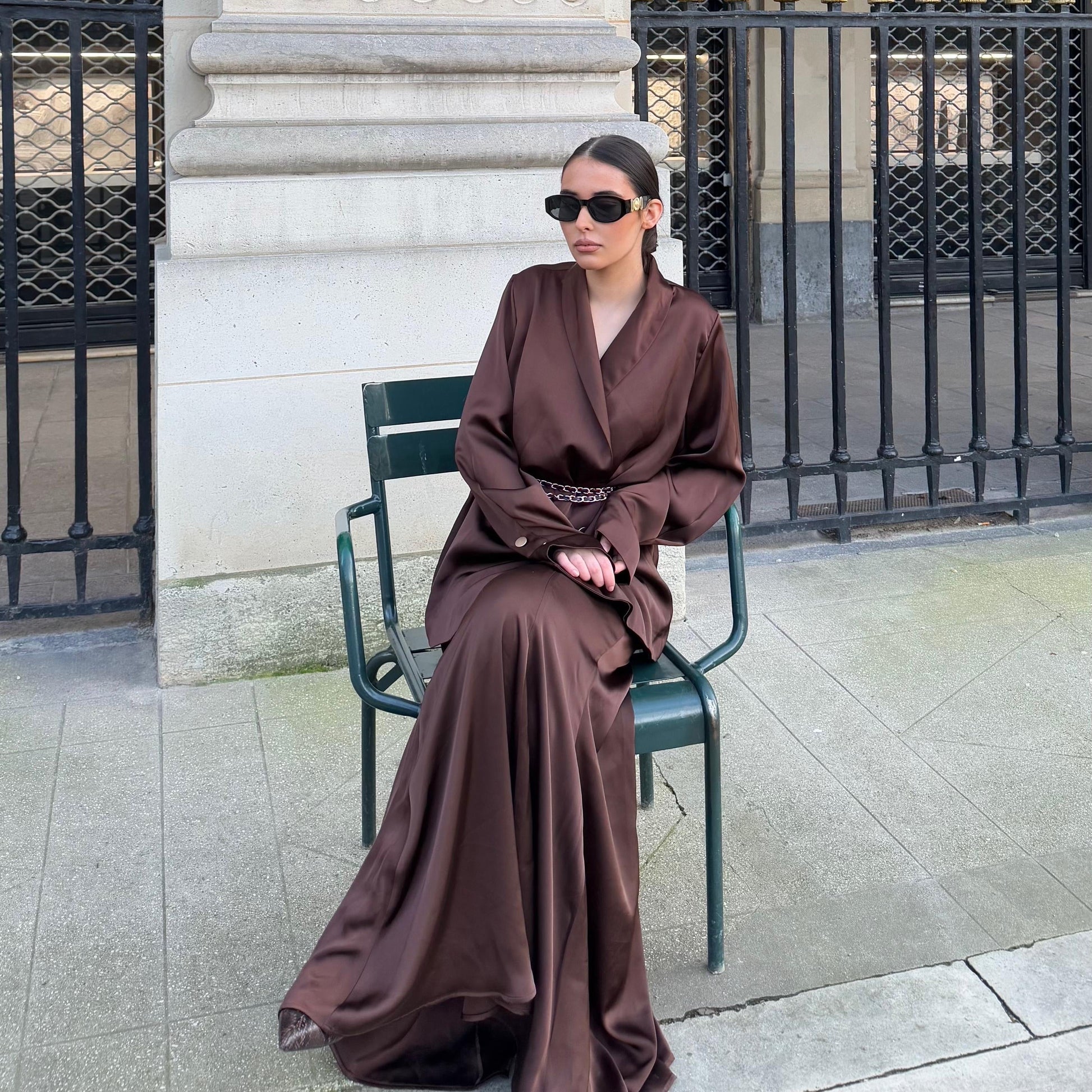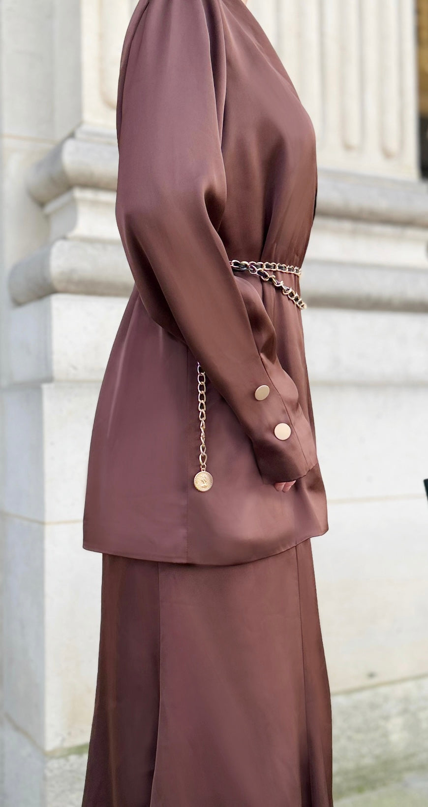 Ensemble en soie composé d’une chemise et d’une jupe longue marron, rehaussé de détails raffinés avec des boutons dorés.