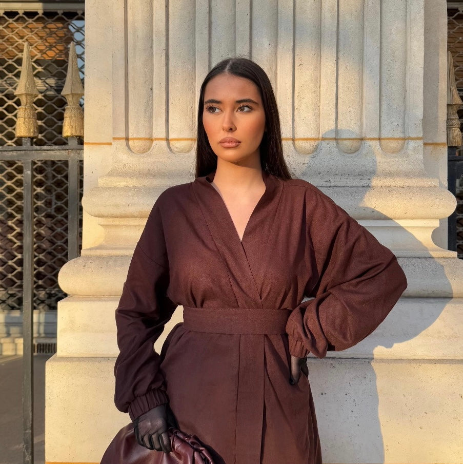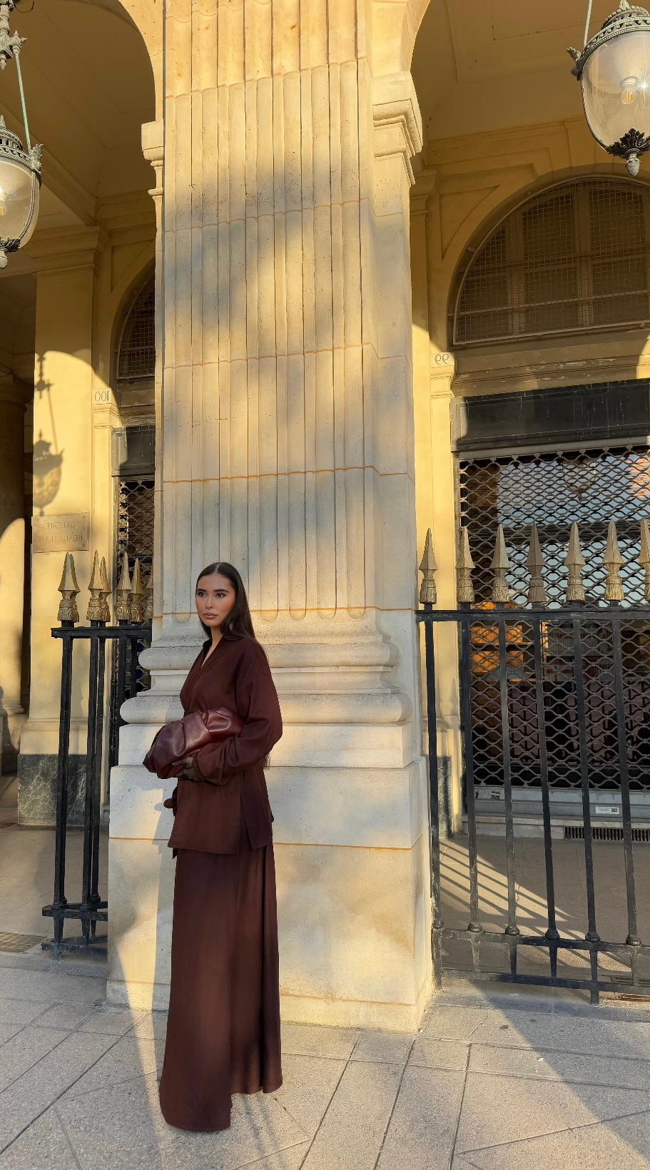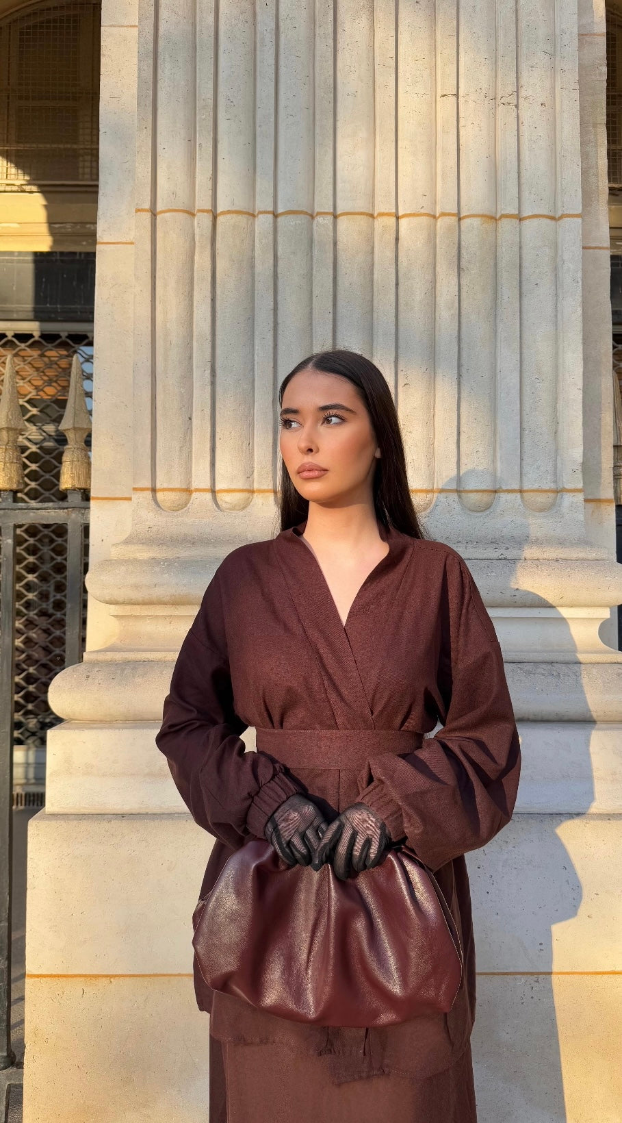 Ensemble en lin marron composé d’un haut ceinturé et d’une jupe longue assortie. Une silhouette douce et naturelle, mêlant confort et élégance au quotidien.