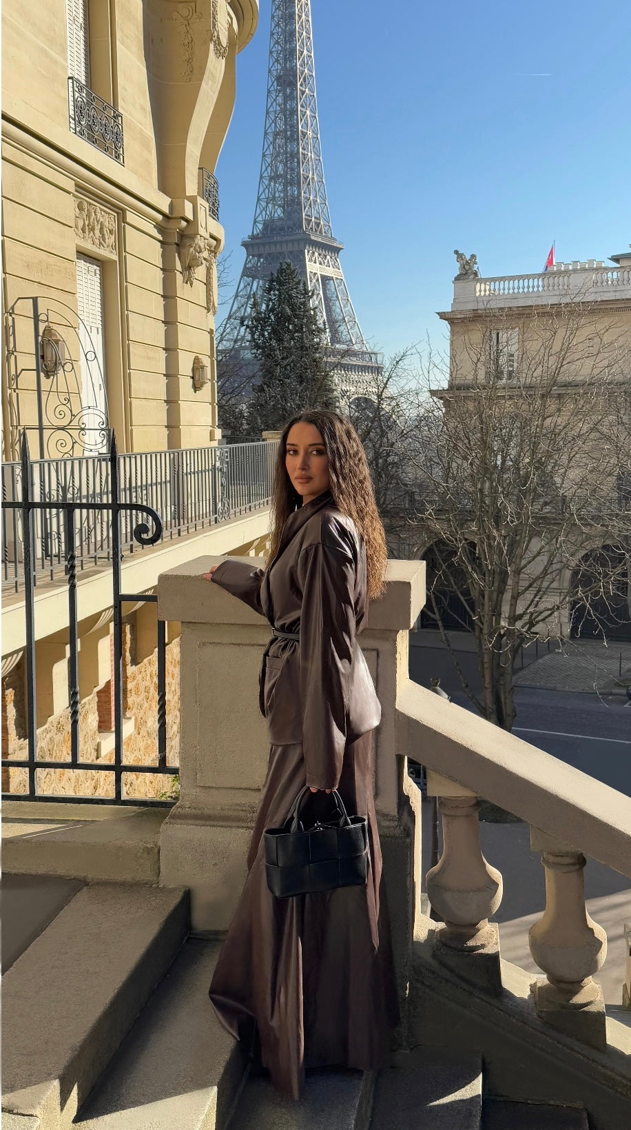 Ensemble en cuir marron composé d’une chemise et d’une jupe longue marron.
