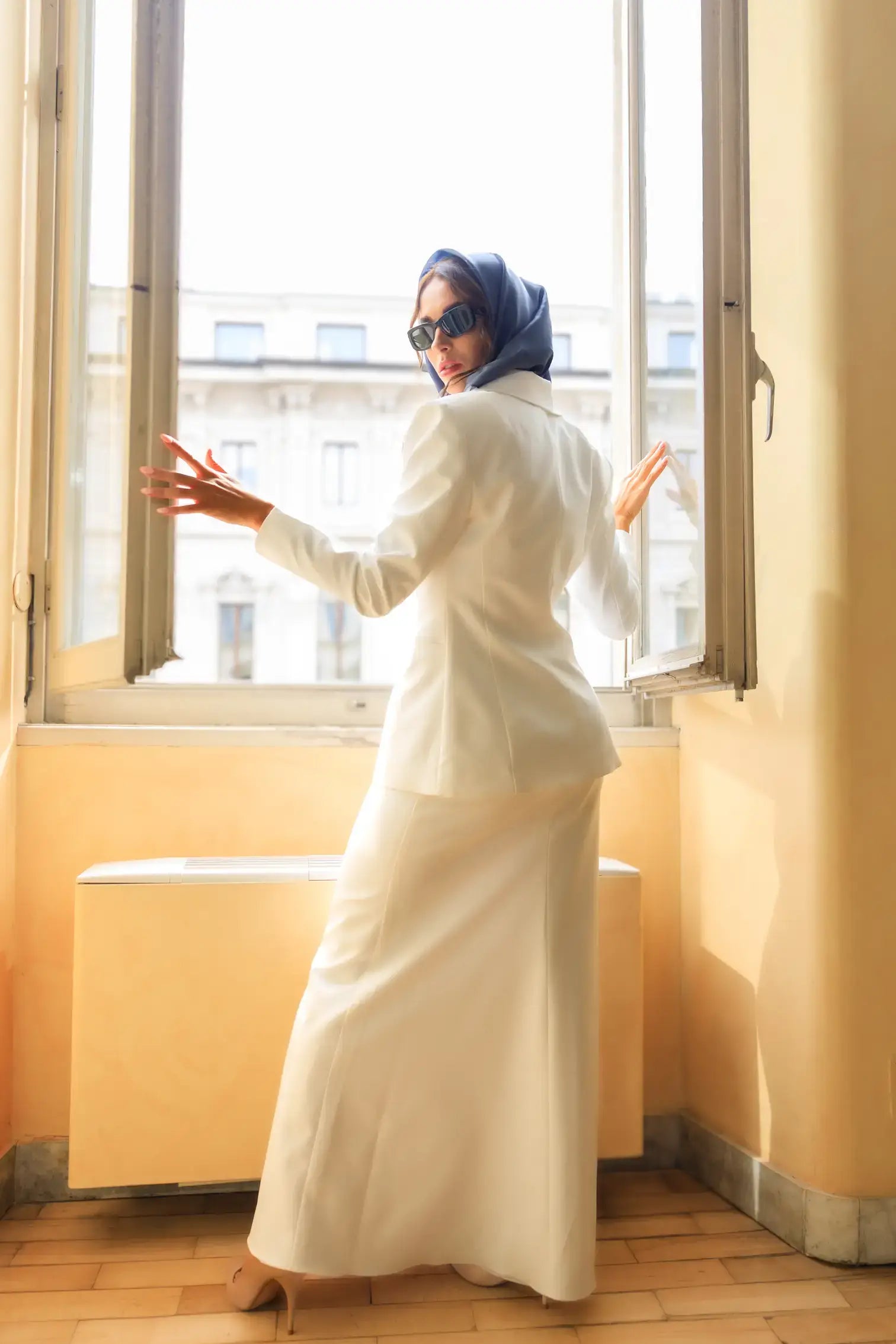 L’Ensemble Oriana se compose d’un blazer à coupe classique accompagné d’une jupe longue assortie.