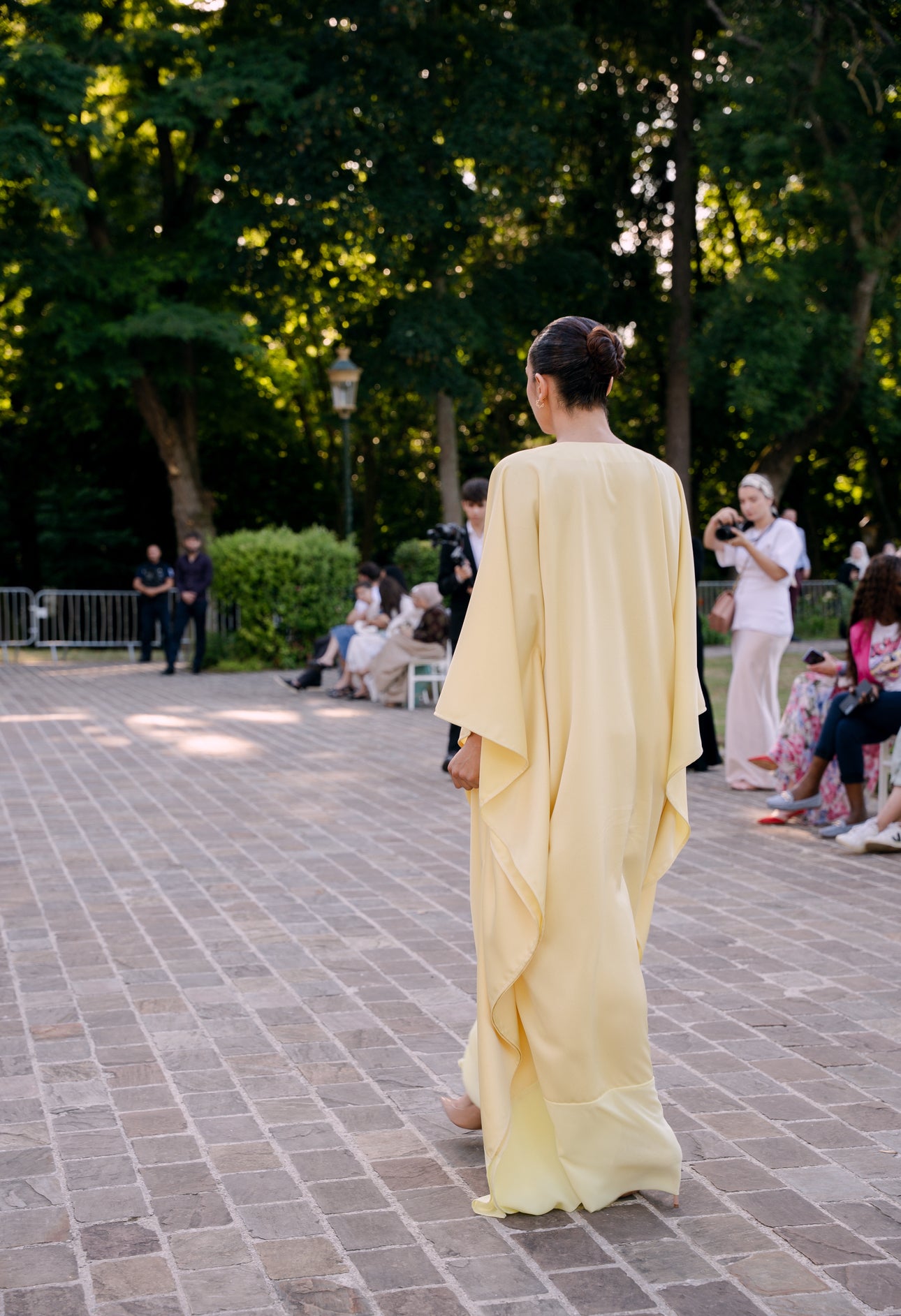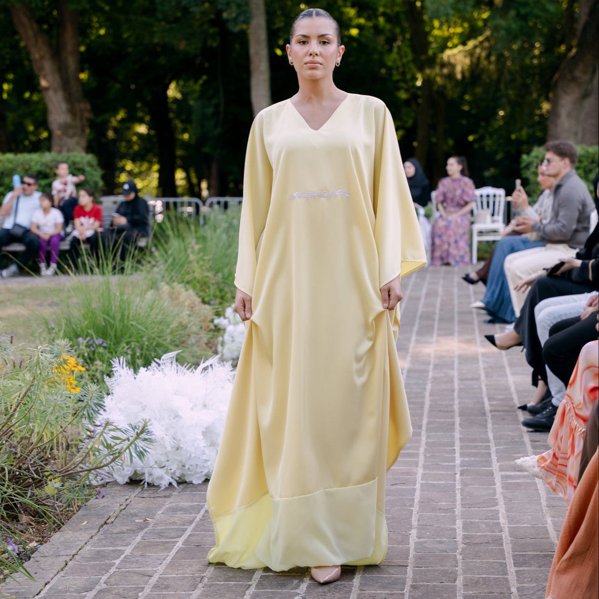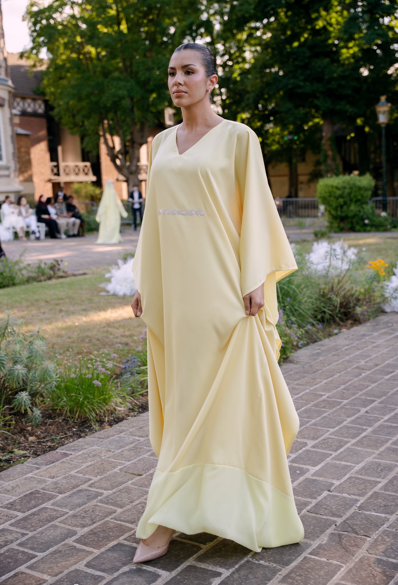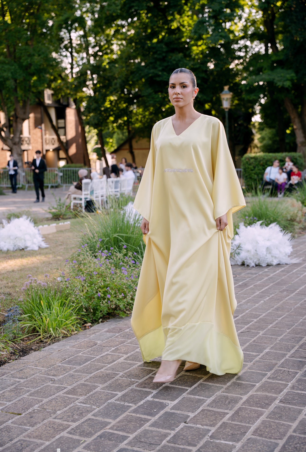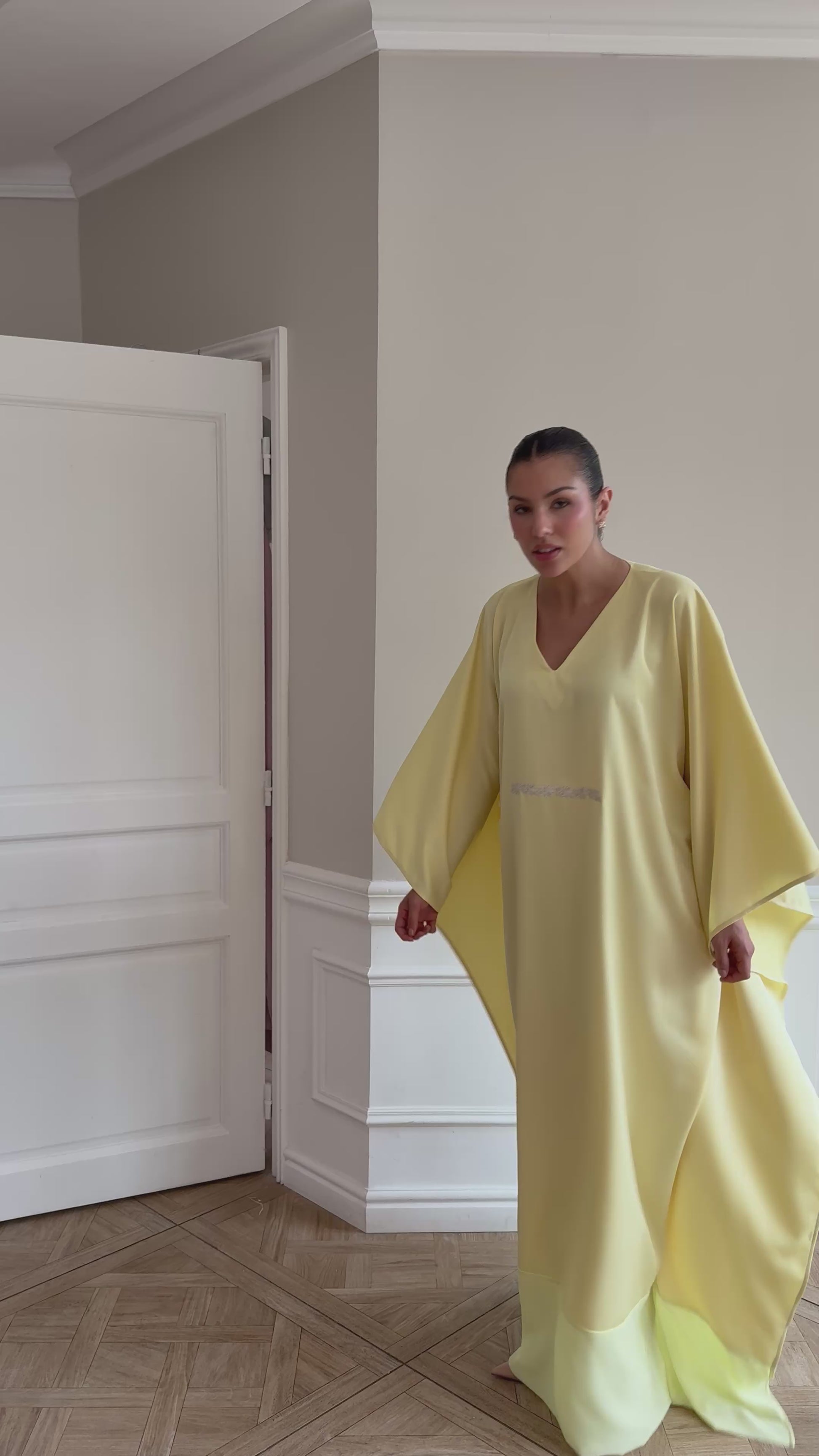Élégance pure et douceur printanière se rencontrent dans cette robe longue fluide en soie jaune pâle. Confectionnée dans un 100% satin de soie, cette pièce met en valeur une silhouette libre et gracieuse, avec ses manches amples et sa coupe fluide. Une délicate broderie ton sur ton orne subtilement la taille, apportant une touche de raffinement discret. Idéale pour des cérémonies en plein air, des soirées élégantes ou simplement pour rayonner avec grâce et légèreté.