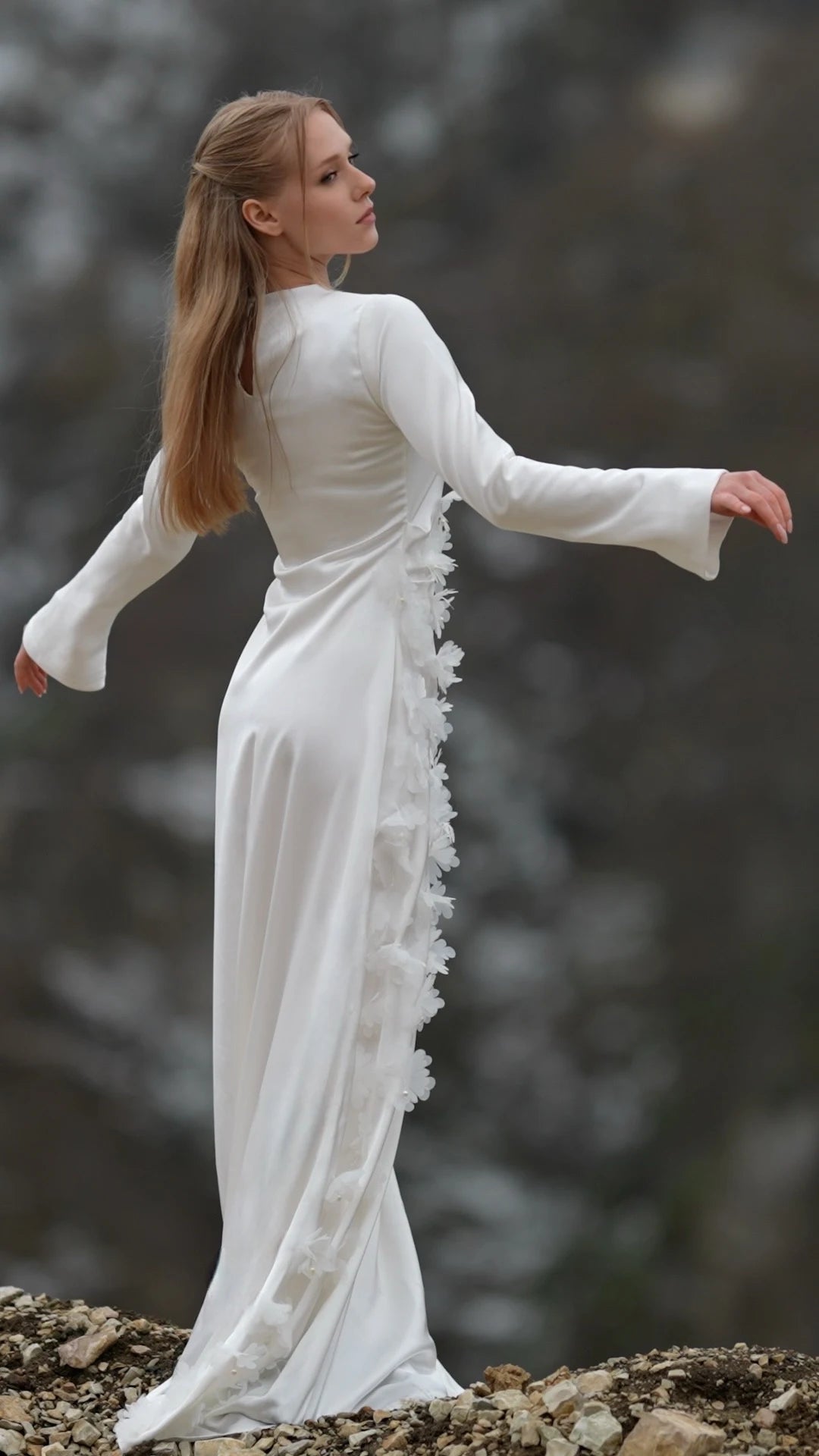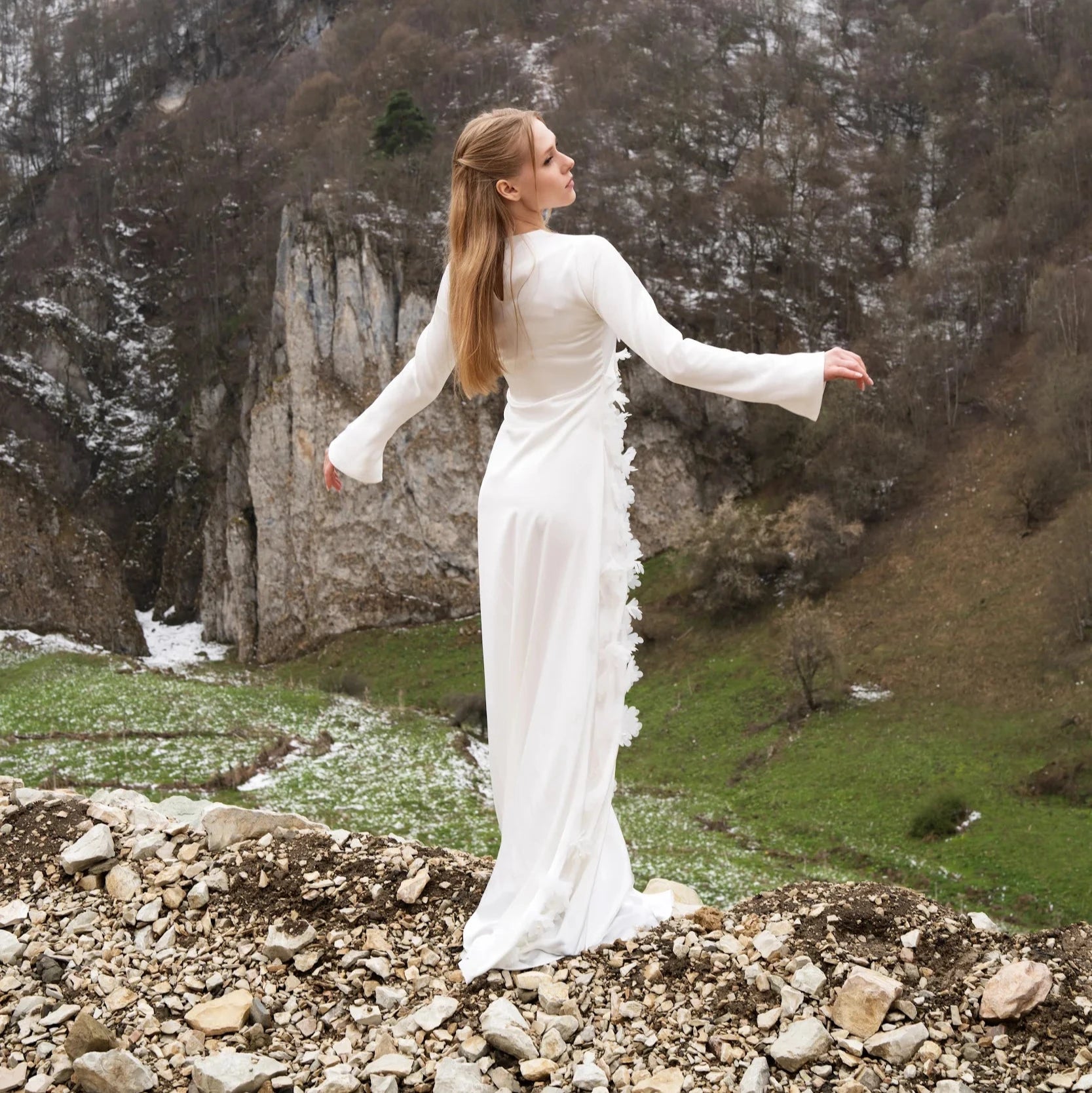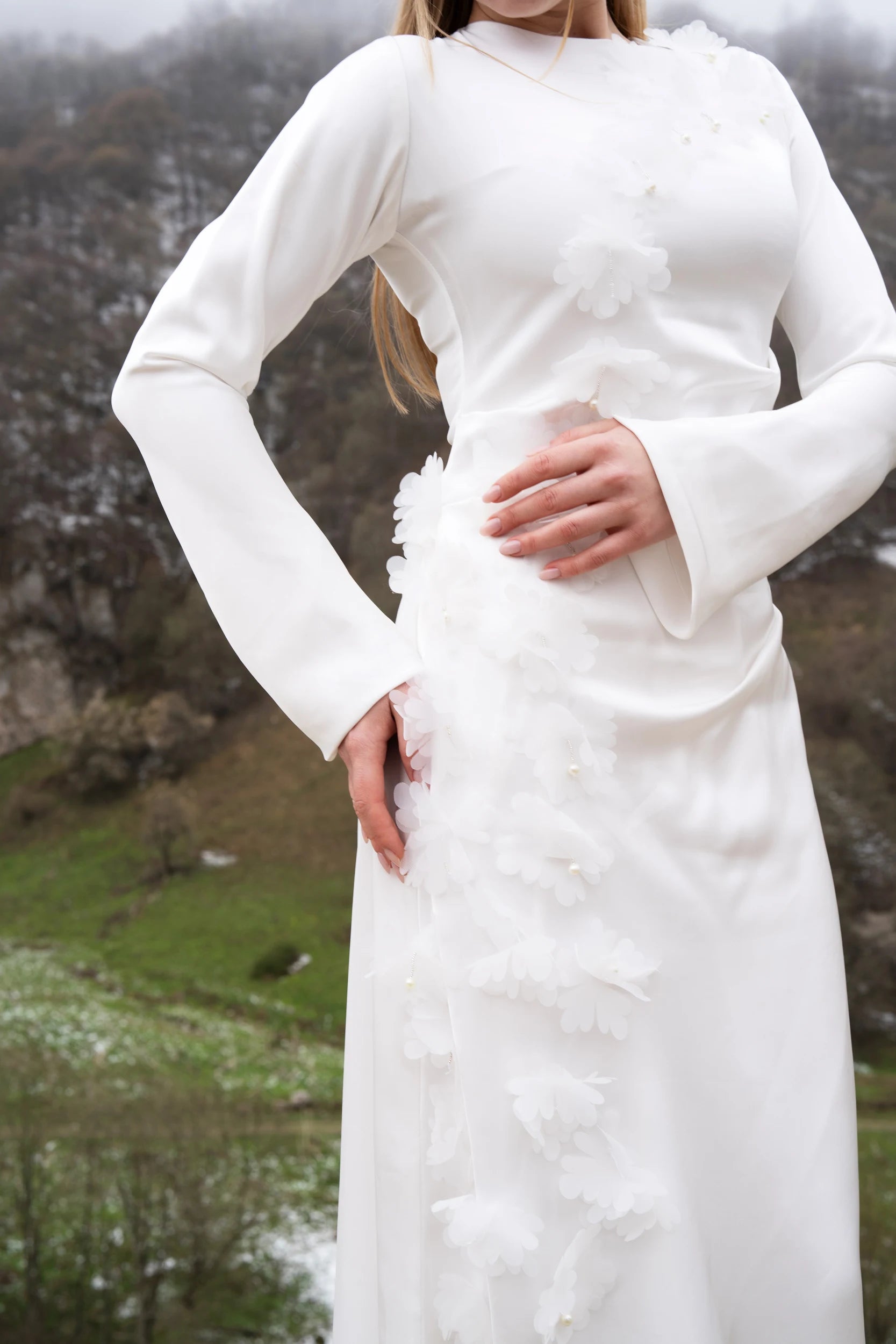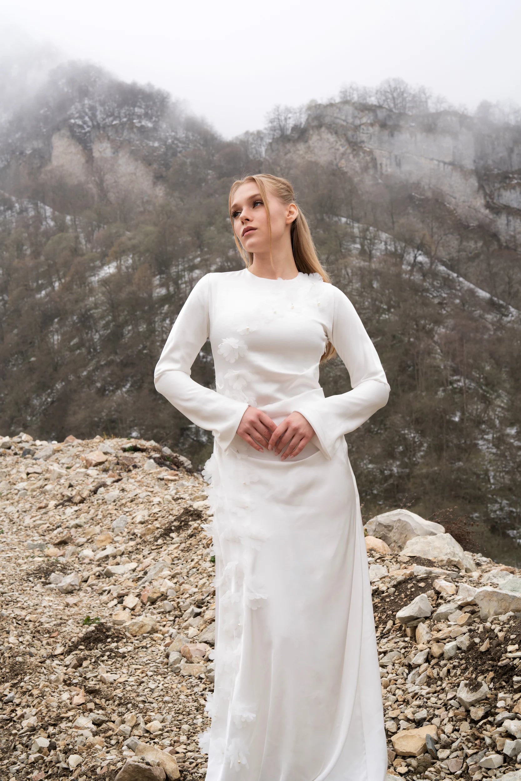 Robe en soie issue de la collection Lot Blanc, présentée lors de la Fashion Week de Monaco. Une pièce élégante et lumineuse, ornée de délicats détails floraux qui célèbrent la féminité avec subtilité.